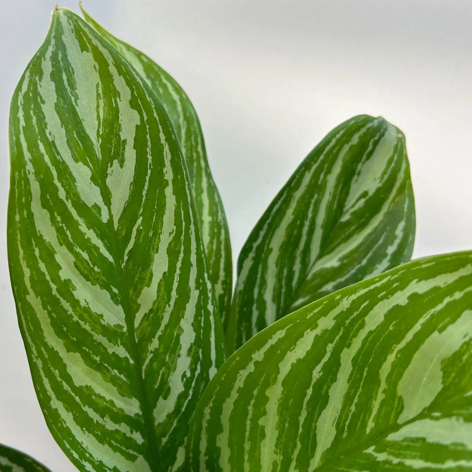 Der Kolbenfaden (Aglaonema ‚Stripes‘) gehört zu den Aronstabgewächsen, stammt ursprünglich aus Südostasien und ist vor allem wegen seiner malerischen Blattzeichnung beliebt. Die elliptischen Blätter mit langen Stielen sind ganzjährig sattgrün, können bis zu 30 cm lang werden und besitzen besondere auffällige silbrig glänzende Streifen. Die pflegeleichte Schmuckblattpflanze wächst aufrecht und mit genug Platz kann sie bis zu 1 m groß werden.