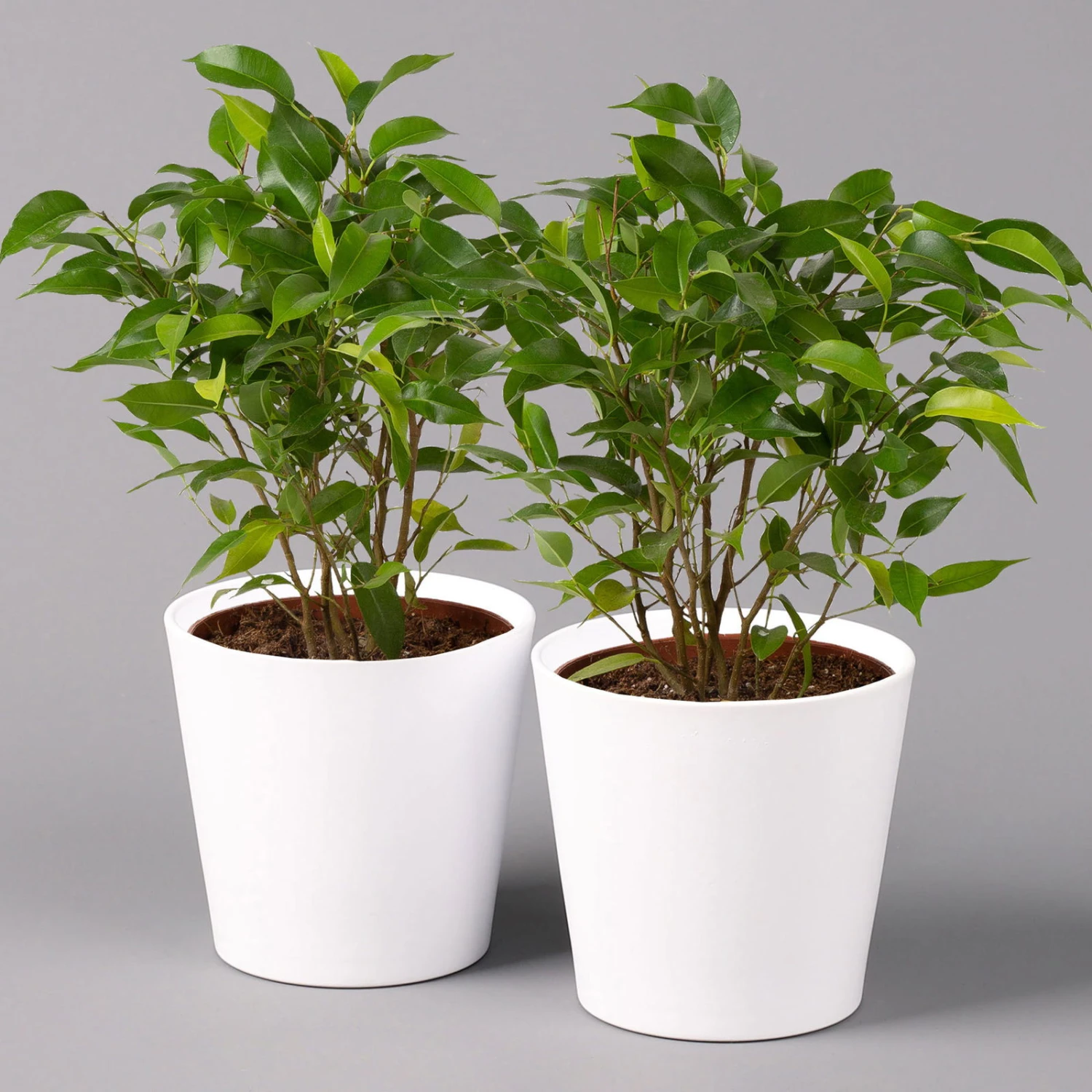 Der Ficus benjamina ‚Natasja’‘ mit seinen dunkelgrünen, glänzenden Blättern ist ein Highlight für jeden Raum. Bekannt ist diese Zimmerpflanze auch unter dem Namen Birkenfeige und besticht mit ihrem buschigen Wuchs und den spitz zulaufenden Blättern. Ihre Birkenfeige macht sowohl im Wohnzimmer als auch im Office eine gute Figur und fühlt sich in hellen sowie halbschattigen Lagen gleichermaßen wohl. Auch für Ihr Schlafzimmer ist der Ficus benjamina ‚Natasja‘ die richtige Wahl, da er Schadstoffe, wie z.B. Kohlenmonoxid abbauen kann. Gießen Sie den Ficus eher sparsam, das Substrat können Sie gerne antrocknen lassen. Im Sommer dürfen Sie Ihre Birkenfeige auch im Freien an einem windgeschützten Standort ohne direkte Sonneneinstrahlung stellen. Achten Sie darauf, dass es der Pflanze nicht zu kalt wird, denn auch im Winter dürfen die Lufttemperaturen im Raum nicht unter 15 Grad Celsius fallen. Bitte stellen Sie Ihre Birkenfeige außerhalb der Reichweite von Kindern oder Hautieren auf, da ihr Milchsaft giftig ist.