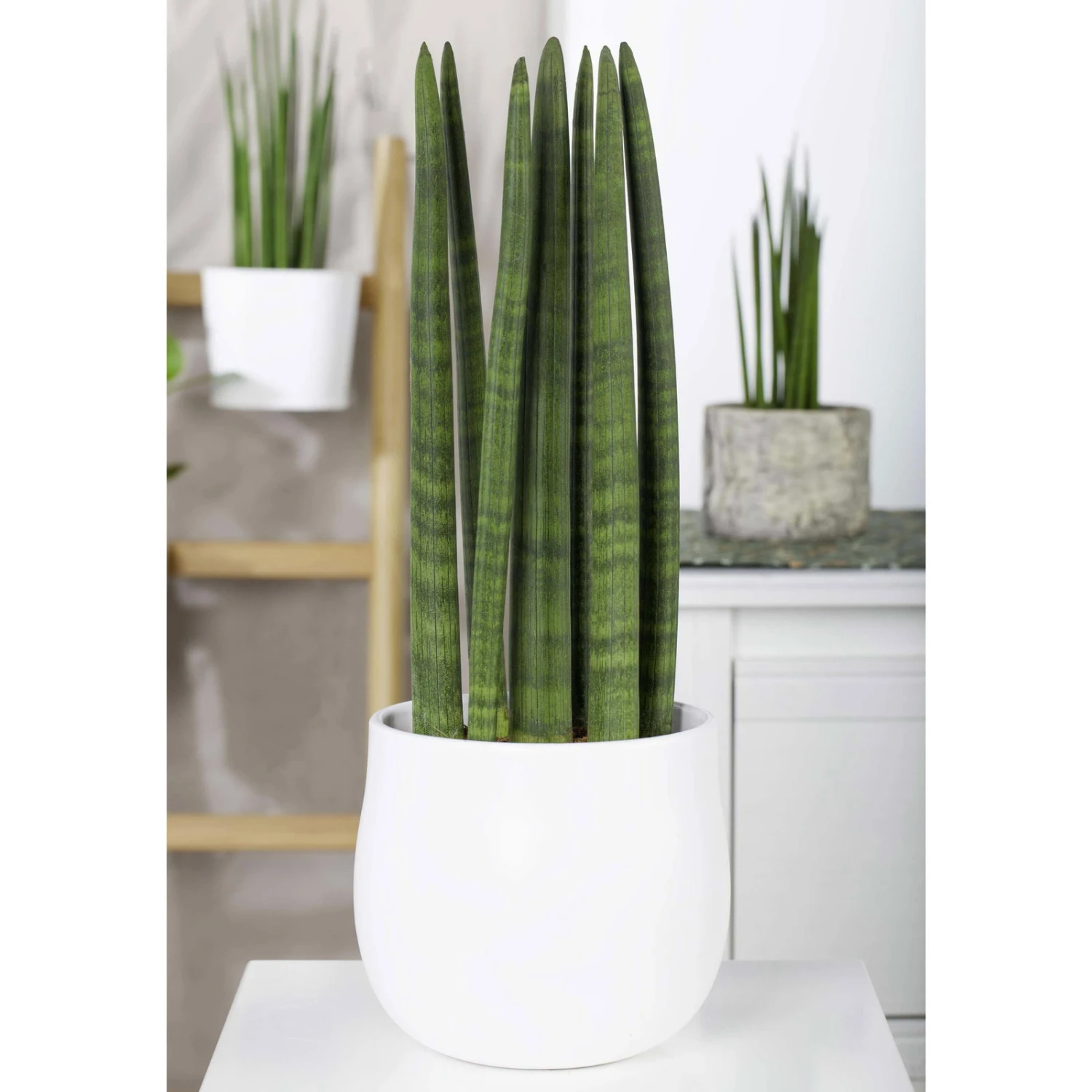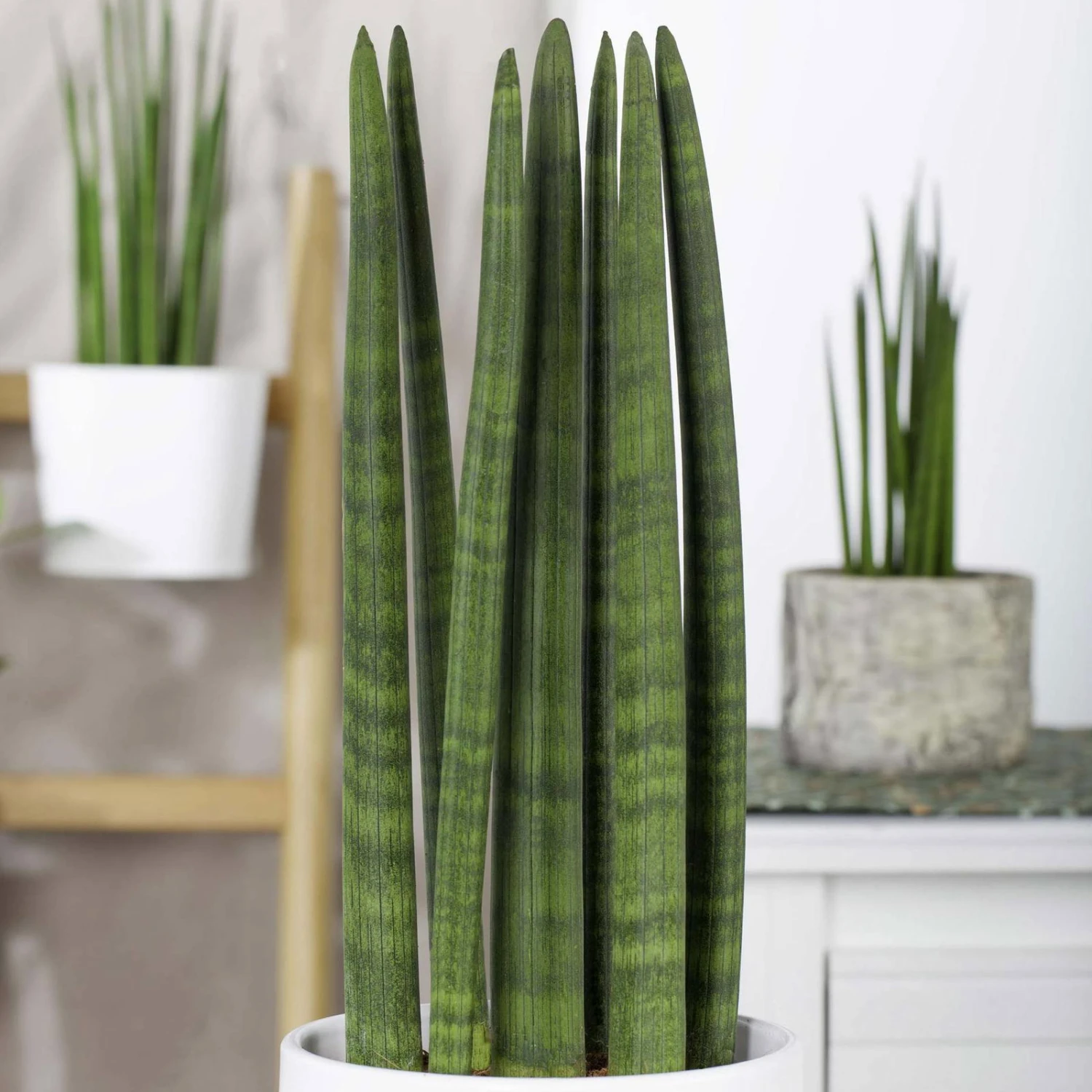 Die Sansevieria cylindrica ‚Straight‘ besticht mit ihrer geraden und dynamischen Wuchsform und gilt als eine der anspruchslosesten Zimmerpflanzen. Der Bogenhanf profitiert von einem sonnigen Standort und darf sogar an einem Südfenster gerne Platz nehmen. Hinsichtlich der Wassergaben dürfen Sie sich gerne zurückhaltend zeigen, denn Ihre Sansevieria cylindrica ‚Straight‘ verträgt Trockenheit wesentlich besser als Staunässe. Diese tropische Pflanze fühlt sich ausschließlich in beheizten Räumen wohl und braucht ganzjährig Raumtemperaturen um 20 Grad Celsius, gerne auch etwas höher. Da der Bogenhanf diverse Schadstoffe wie Benzole oder Xylole der Luft entzieht, verbessert die Sansevieria nachhaltig das Raumklima und empfiehlt sich nicht zuletzt als eine sympathische Büropflanze.