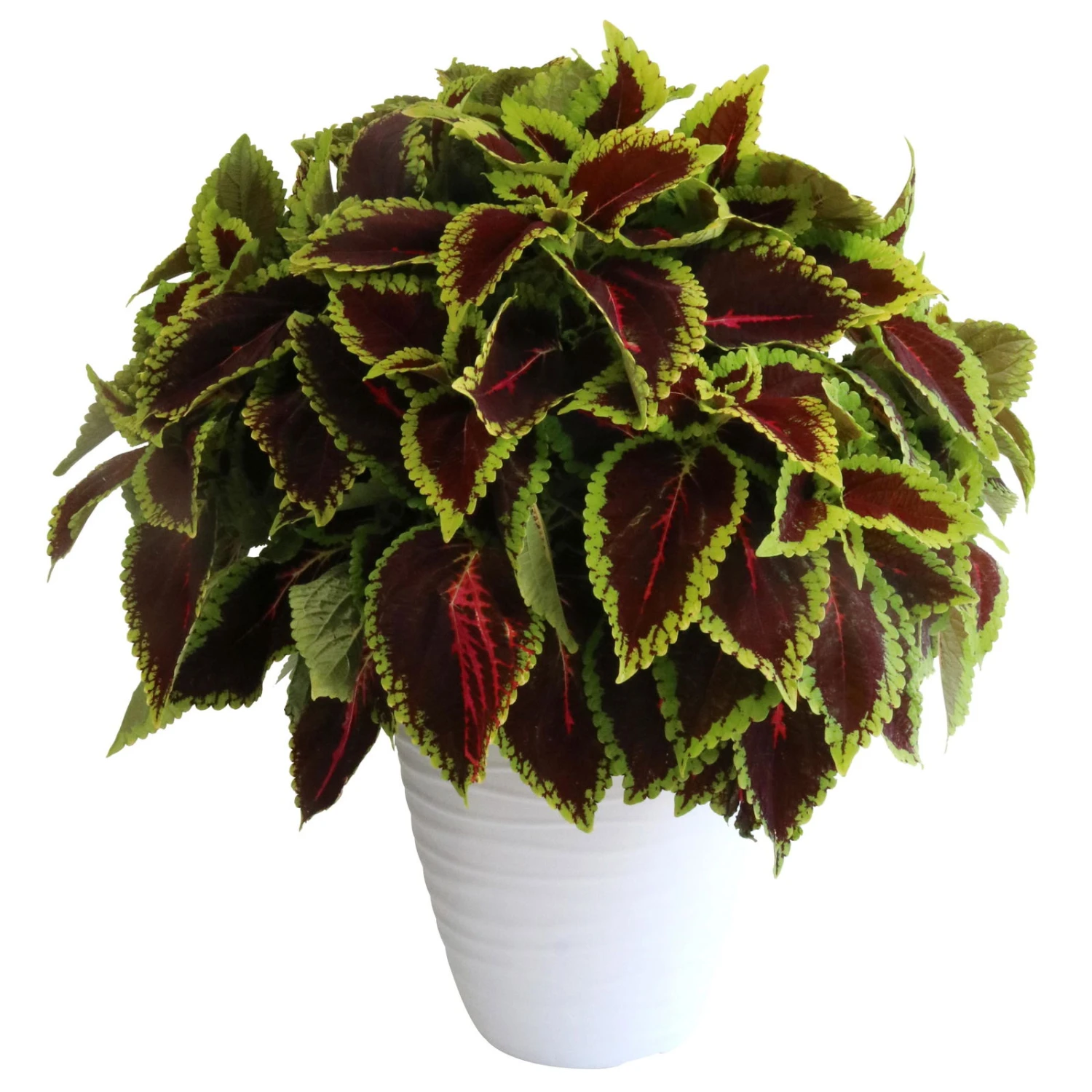 Die keilförmigen, gekerbten Blätter der Buntnessel (Solenostemon scutellarioides ‚Alligator Alley‘), früher auch Coleus blumei genannt, begeistern mit ihrer dunkelroten Mitte, die mit pinken Adern gezeichnet und durch einen hellgrünen Rand eingefasst ist. Zur Nomenklatur kann auch der Gattungsname Plectranthus verwendet werden. Die Buntnessel kann eine Wuchshöhezwischen 20 und 60 cm erreichen.