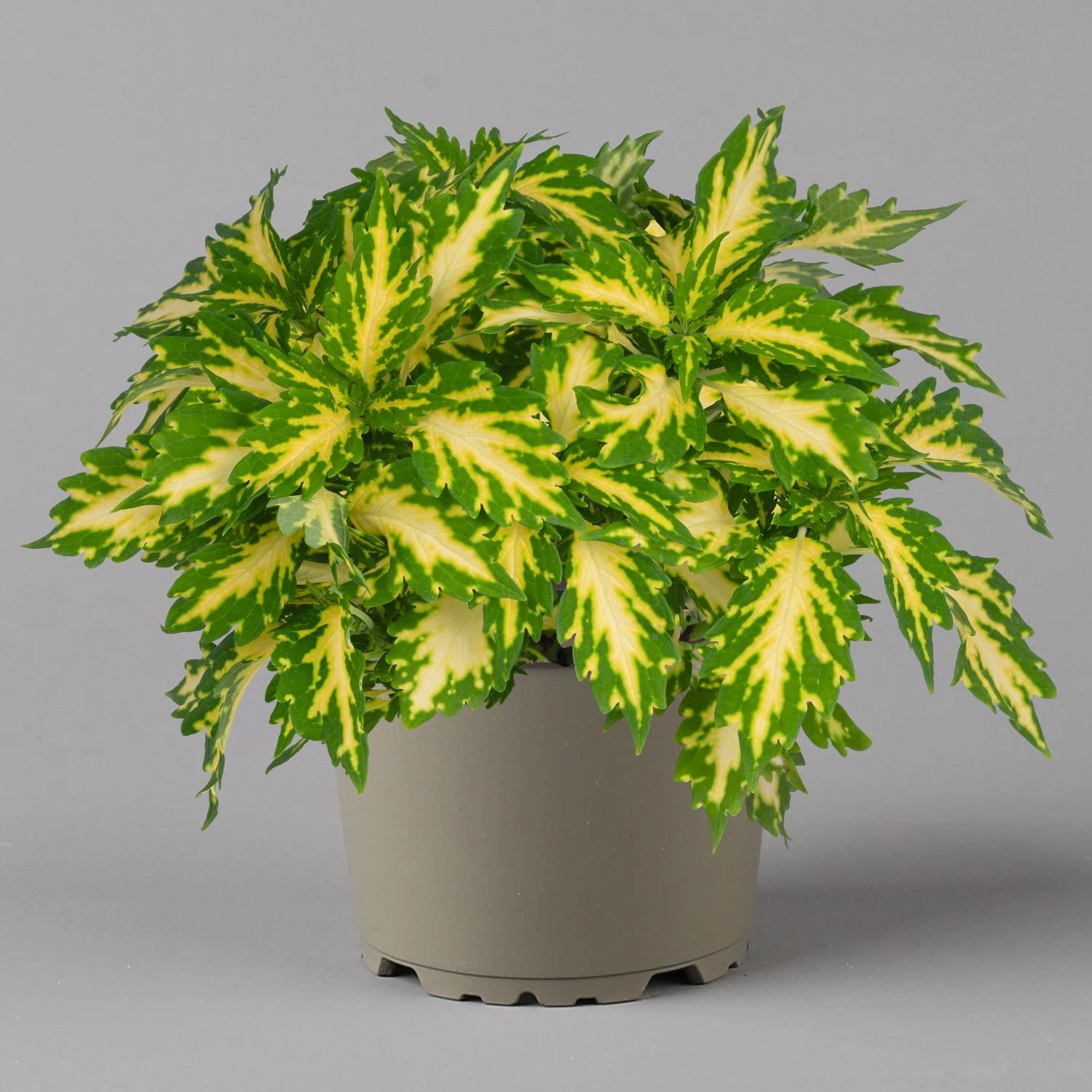 Die keilförmigen, grob gesägten Blätter der Buntnessel (Solenostemon scutellarioides ‚Palisade‘), früher auch Coleus blumei genannt, begeistern mit ihrer Panaschierung in Grün und Gelb. Zur Nomenklatur kann auch der Gattungsname Plectranthus verwendet werden. Die Buntnessel kann eine Wuchshöhezwischen 20 und 60 cm erreichen.