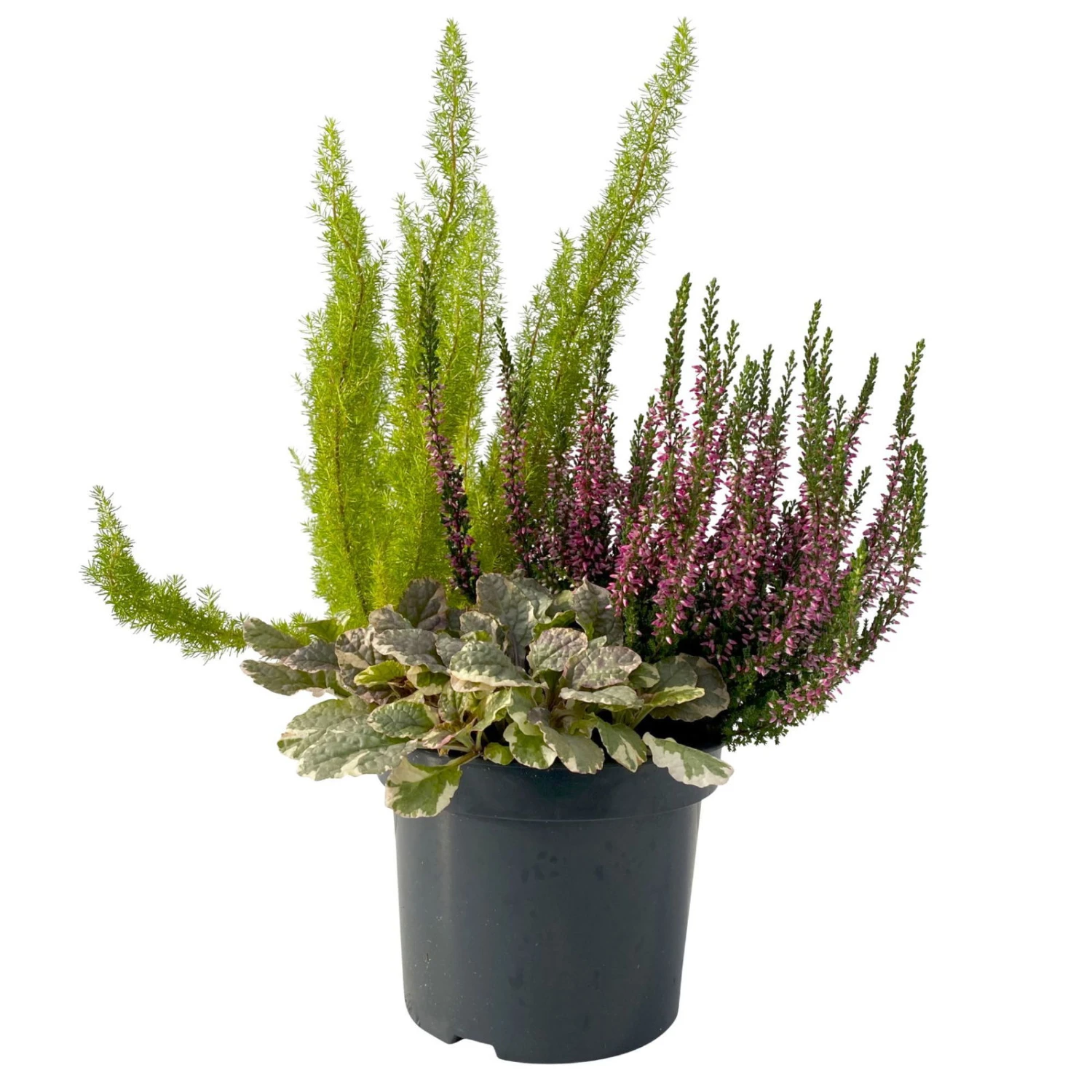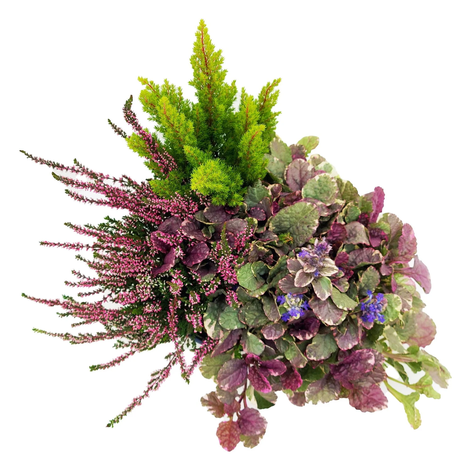Das Trio aus Knospenheide (Calluna vulgaris), Kriechender Günsel (Ajuga reptans) und Baumheide (Erica arborea) bildet mit ihrer interessanten Kombination aus Farbe und Blattstruktur eine abwechslungsreiche und herbstliche Einheit. Die Blätter des Kriechenden Günsels sind rundlich bis oval. Die Calluna hat schuppenförmig an den Ästchen anliegende, nach oben eingerollte, ledrige Blätter. Und die Baumheide hat nadelartige, kleine, dünne Laubblätter. Der Wuchsform der Ajuga ist aufrecht und bodendeckend, die der Baum- und Knospenheide dagegen ist buschig und aufrecht. Die Baumheide kann eine Wuchshöhe von bis zu 100 cm und eine Breite von bis zu 60 cm erreichen.