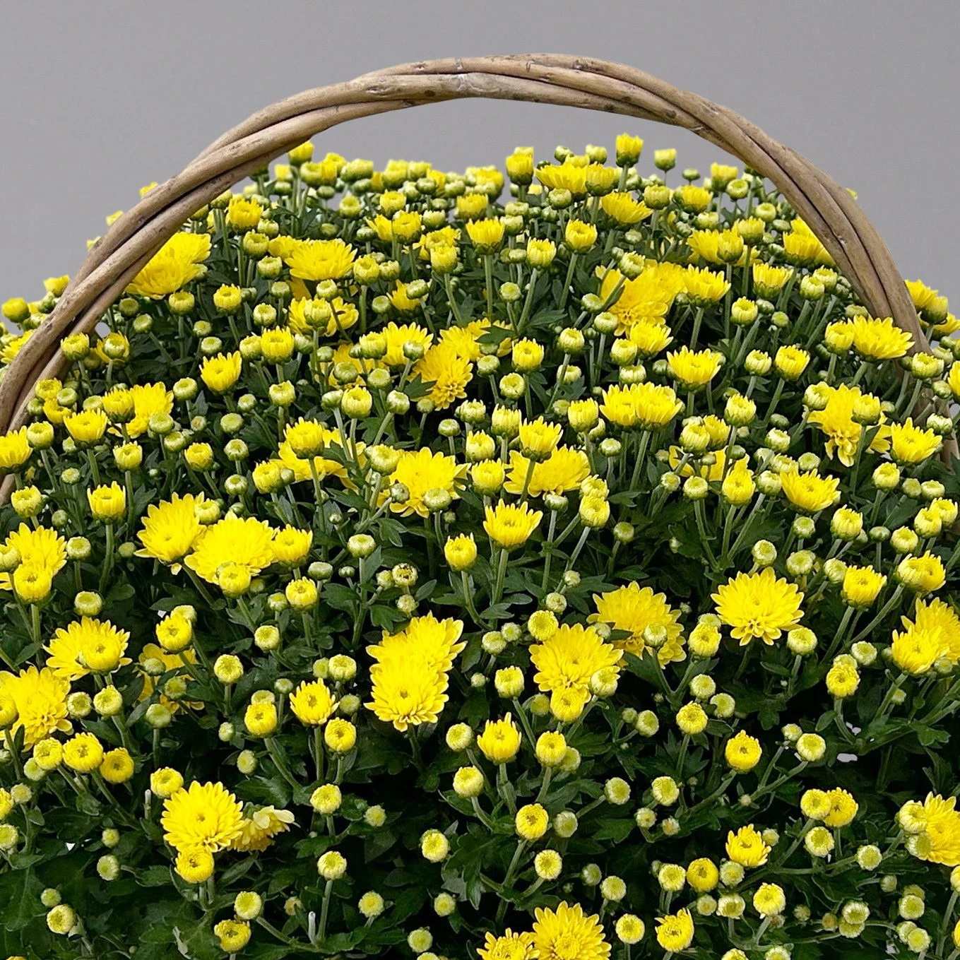 Diese schöne Chrysantheme bringt in sonnigem Gelb Farbe in Ihr Zuhause. Die Pflanze hat sternförmige Blüten und wächst üppig in einem naturfarbenen Henkelkorb. Somit ist Chrysanthemum multiflora nicht nur hübsch anzusehen, sondern auch ein ideales Arrangement zum Verschenken oder die perfekte Dekoration für Ihr Zuhause.