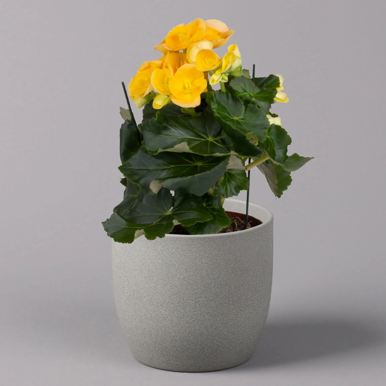 Die einzelnen Blüten der Elatior-Begonie stehen traubenförmig zusammen und leicht erhöht über dem Laub. Die rundlichen, gefüllten Blüten in Gelb und Orange erfreuen über Monate hinweg mit ihrer überschwänglichen Pracht.