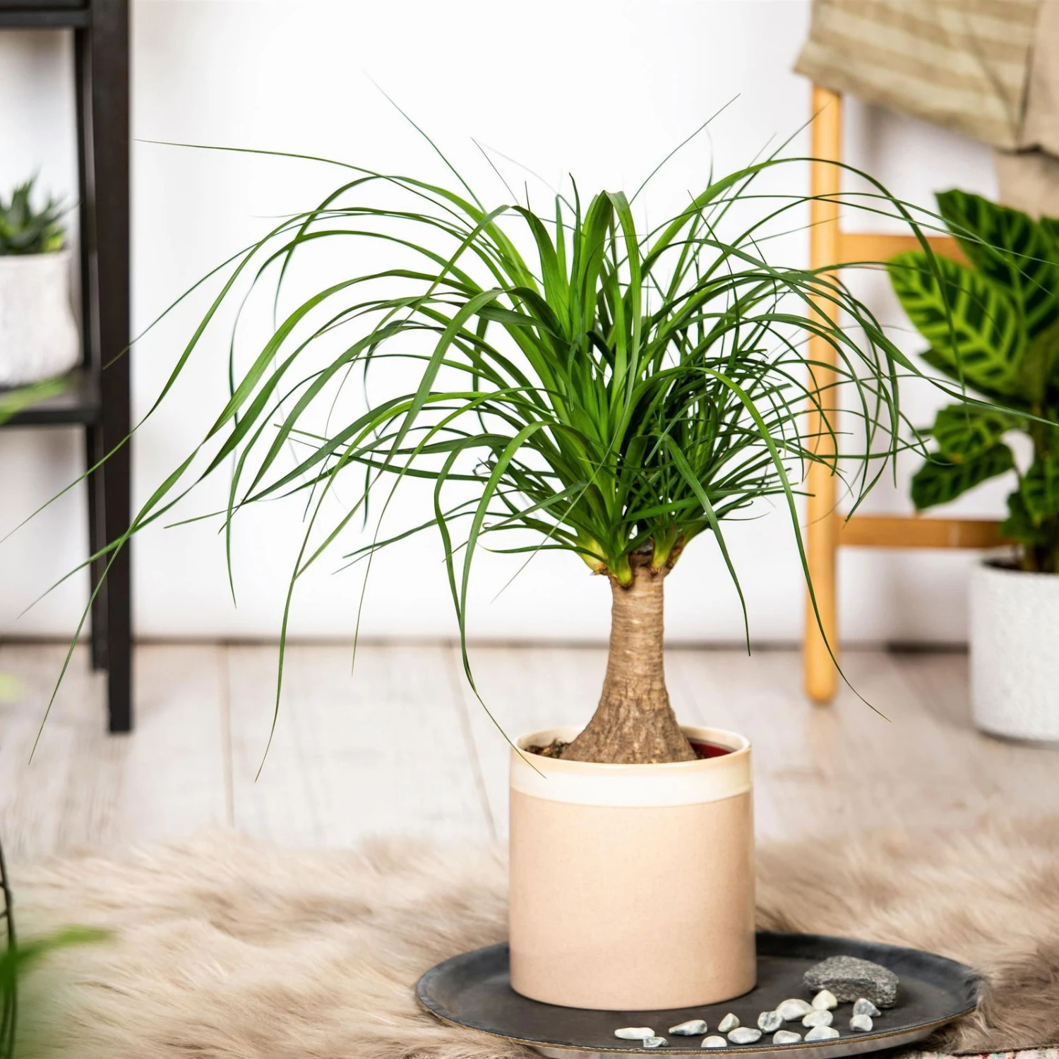 Der Elefantenfuß (Beaucarnea recurvata), ist ursprünglich in Mexiko beheimatet und ist eine exotisch anmutende Zimmerpflanze. Charakteristisch sind die lanzettlichen und langen Blätter, die besonders wild ausfächern und bogig herunterhängen. Der Elefantenfuß wächst sehr langsam und kann, je nach Standort und Pflanztopf, eine Höhe von bis zu 1,5 Metern errreichen.