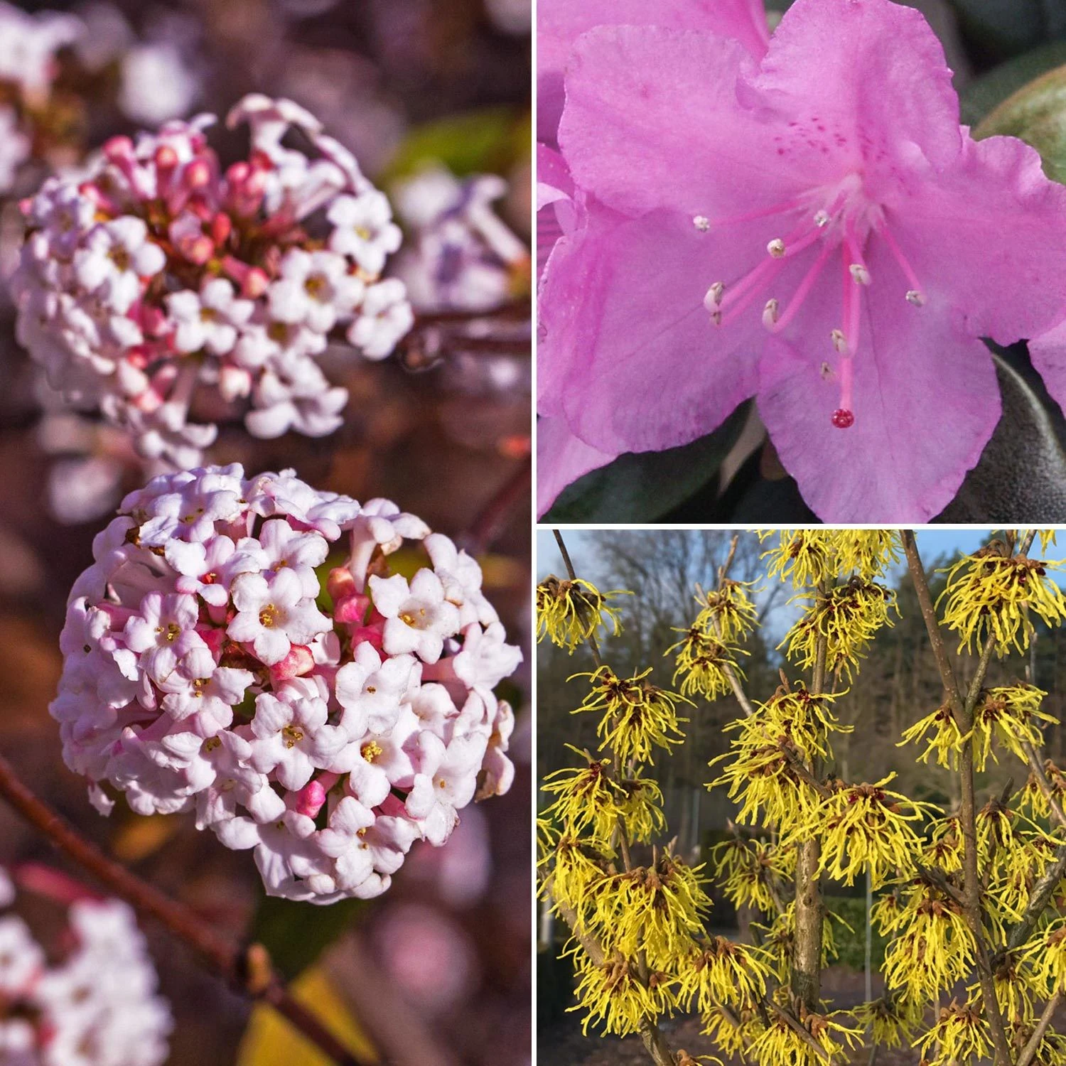 Mit dem Gehölz-Set Winterblüher bringen Sie Ihren Garten auch in den kühleren Monaten zum Blühen. Freuen Sie sich auf die herrlichen Blüten von Rhododendron ‚P. J. Mezitt‘, Gelbe Zaubernuss und Winter-Schneeball ‚Charles Lamont‘.