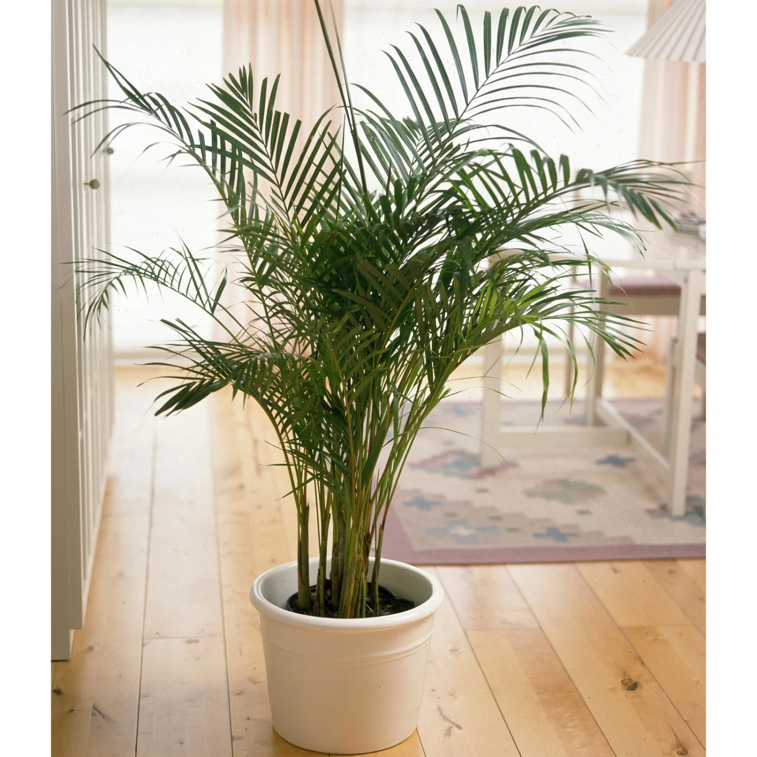 Die Goldfruchtpalme (Dypsis lutescens), auch als Areca-Palme bekannt, lässt sich in jedem Raum dekorativ in Szene setzen und besticht mit den lanzettförmigen Blättern in hellen Grüntönen. Nach einem oder zwei Standjahren bilden sich effektvolle, feinfiedrige Palmwedel, die bei der Jungpflanze noch nicht zu sehen sind. Die Goldfruchtpalme stammt aus Madagaskar und fühlt sich in hellen, absonnigen Lagen wohl. Die Dypsis lutescens benötigt nicht viel Wasser, jedoch dürfen Sie den Wurzelballen nie austrocknen lassen. Ihre Areca-Palme ist ein Wohlfühlgewächs und filtert aus der Raumluft mehrere Schadstoffe wie Benzole oder Ammoniak effektiv heraus.