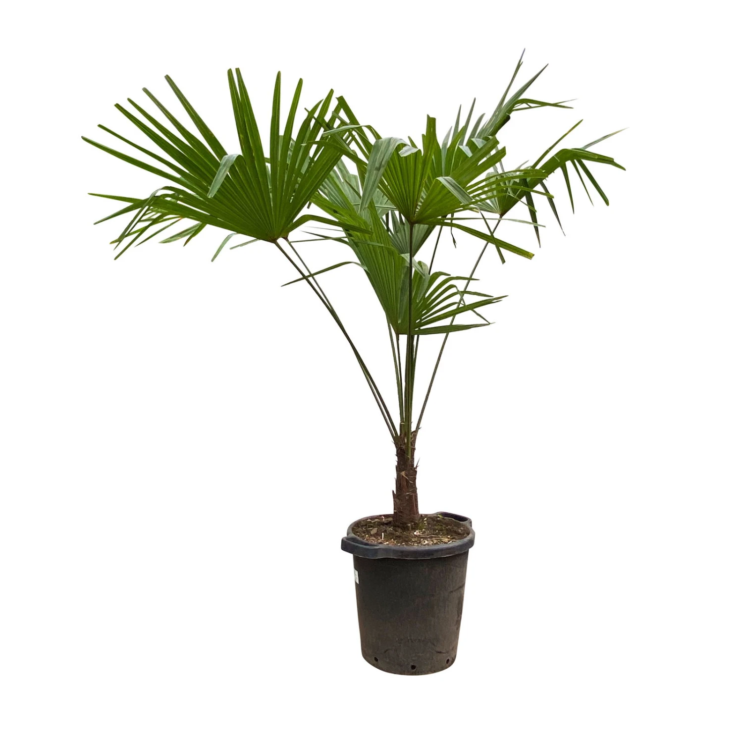 Die fächerförmigen Blätter der Hanfpalme (Trachycarpus fortunei) haben einen langen, festen Blattstiel und begeistern das ganze Jahr über mit satt grüner Farbe. Die Hanfpalme bildet einen Stamm an dessen oberer Spitze ein Blattschopf steht. Der aufrechte, gerade, unverzweigte Stamm ist mit Hanffasern eingehüllt. Die mediterrane Kübelpflanze kann am Naturstandort eine Wuchshöhe von bis zu 10 Metern erreichen. Im Kübel werden maximal 2 bis 4 Meter Höhe erlangt.