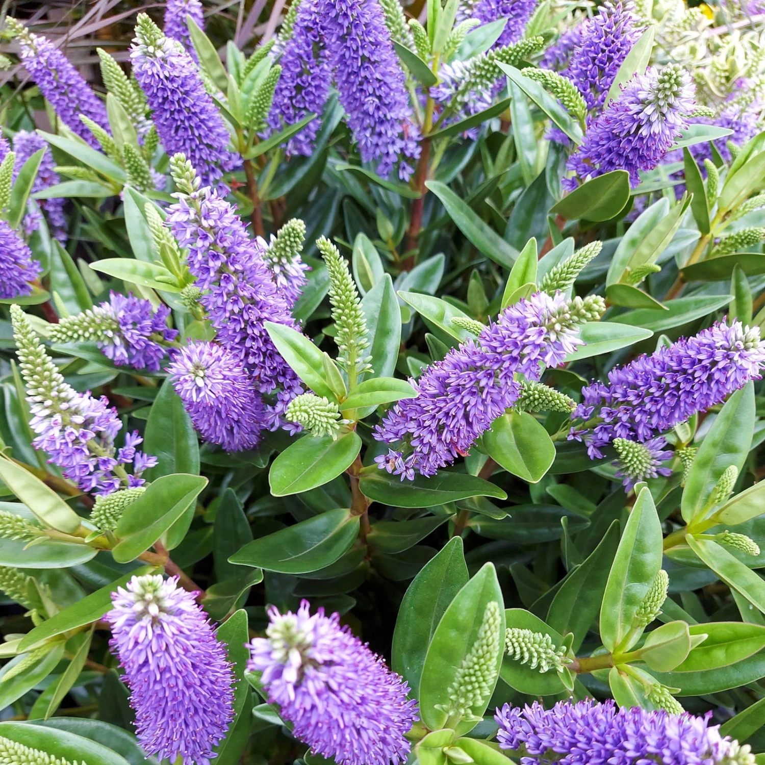 Die großen, lang gestreckten Blätter der Strauchveronika (Hebe andersonii Addenda®) überzeugen in einem satten Grün. Die Pflanze wächst aufrecht und buschig. Die Strauchveronika kann eine Wuchshöhe von 40 bis 60 cm erreichen und auch entsprechend breit werden.