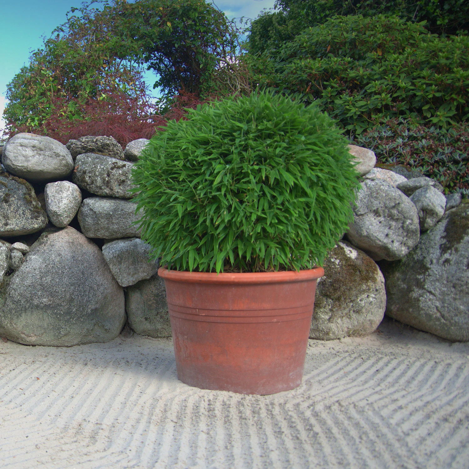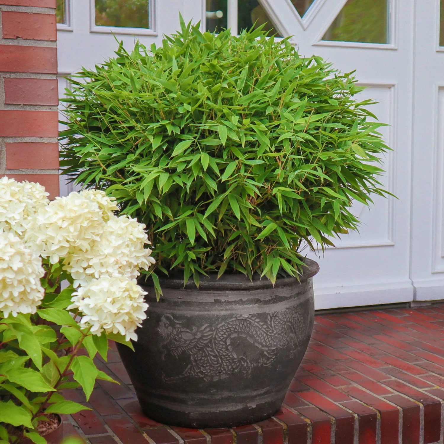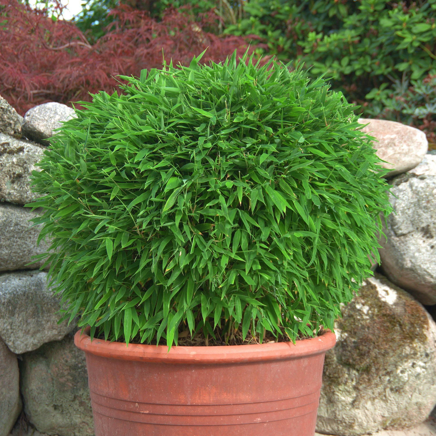 Die Bambus-Kugel Fargesia ‘Moontears‘® EU-S ist ideal zur Verwendung im Kübel auf Balkon und Terrasse, aber auch vor der Haustür. Der Bambus ‘Moontears‘® EU-S erreicht Wuchshöhen (ungeschnitten) von bis zu 150 Zentimetern, ist winterhart und gut schnittverträglich. Im Kübel empfehlen wir eine Winterschutz.