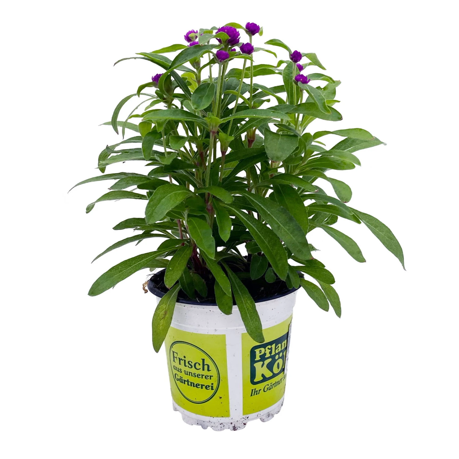 Der Kugelamarant, Gomphrena globosa, ist ein farbenfroher Dauerblüher und wird Sie von Juli bis in den Herbst hinein mit seinen lilafarbenen, kugeligen Blütenständen begeistern. Ob im Beet, dem Balkonkasten, einem schön arrangierten Kübel oder auf dem Grab – die Gomphrena globosa macht überall eine gute Figur. Gerne können Sie den echten Kugelamarant, wie die Gomphrena auch genannt wird, mit Silberblatt, Calocephalus, Cyclamen, Chrysanthemen oder Cyclamen kombinieren. Der Kugelamarant liebt sonnige Standorte und durchlässigen, nicht zu nährstoffreichen Boden. Deshalb ist es ausreichend, wenn Sie Ihren Kugelamarant alle 14 Tage mit etwas Flüssigdünger versorgen. Gegossen wird eher mäßig, wobei Staunässe unbedingt zu vermeiden ist.