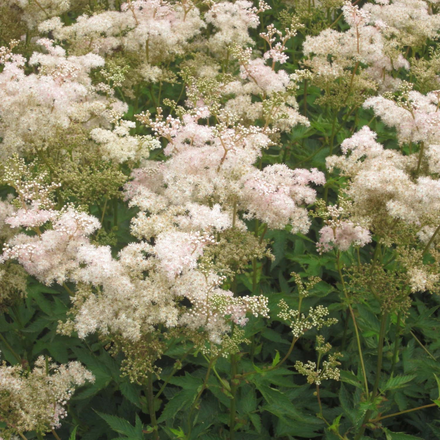 Die ca. 20 cm großen, rosa gefärbten, verzweigten Doldenrispen des Mädesüß ‚Rosa Schleier‘ erscheinen zwischen Juni und August. Die einzelnen Blüten sind winzig, und sternförmig. Nach der Bestäubung bilden sich daraus nur wenige Millimeter große Nussfrüchte.