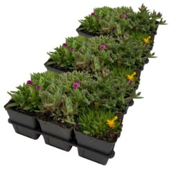 Delosperma (Mittagsblume) sind sukkulente Pflanzen die aus Südafrika stammen und mit ihren leuchtenden Strahlenblüten ab Mai hervorstechen. Diese anspruchslosen Zierpflanzen sind eine ideale Begrünung für Steingärten und Trockenmauern. Eine gute Drainage ist für die erfolgreiche Pflege der teppichbildenden Mittagsblume entscheidend. Volle Sonne ist ein weiterer Faktor, der ein üppiges Wachstum und gute Gesundheit dieser Zierpflanzen begünstigt. Die farbintensiven Blüten öffnen sich nur in der Mittagssonne. Die Blätter sind wasserspeichernd. Je trockener der Standort, desto wohler fühlen sich die Pflanzen.