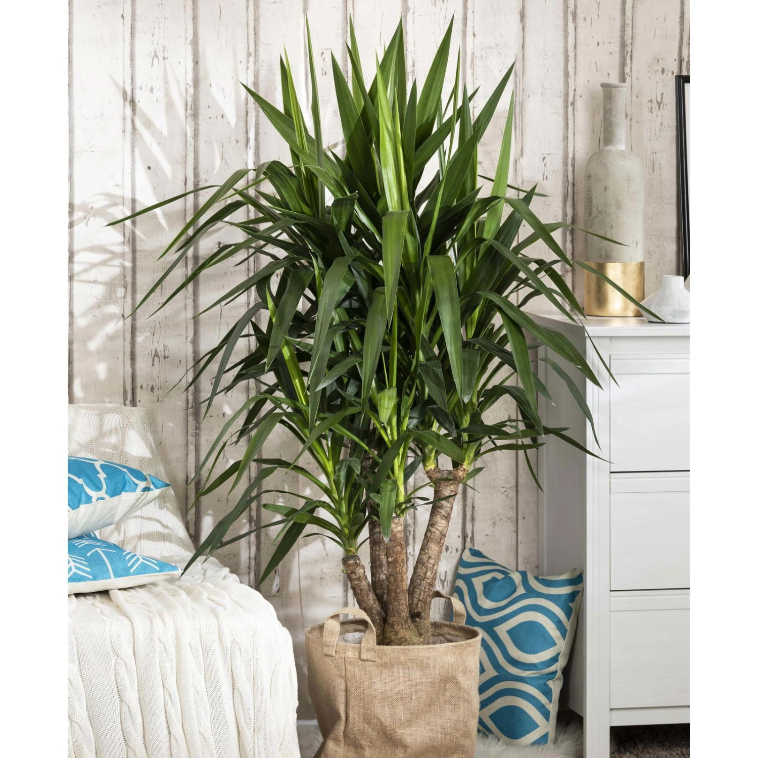 Verschönern Sie Ihr Heim oder Büro mit einer trendigen Zimmerpflanze – die Palmlilie (Yucca elephantipes) gehört zu den exotischen Zierpflanzen, die jeder besitzen sollte. Die pflegeleichte Yucca-Palme aus der mexikanischen Region ist dank ihrer hellgrünen und schlanken Blätter, die spitz nach oben verlaufen, ein optischer Blickfang auf jeder Fensterbank. Bei Pflanzen-Kölle können Sie die angesagte Palmlilie kaufen und in Ihrem Wohnraum oder am Arbeitsplatz als hübsche Deko platzieren. Damit die Yucca Elephantipes optimal wächst und gedeiht, sollten Sie die Grünpflanze an einem hellen und sonnigen Standort aufstellen und nur ab und an mit Wasser gießen. Auf der Fensterbank oder auf einem stylischen Pflanzentisch von Pflanzen-Kölle wirkt die Palmlilie mit ihren Verzweigungen besonders schön und zieht magisch alle Blicke auf sich. Ob als klassische Zimmerpflanze für Zuhause, als Hingucker im Treppenhaus oder als Grünpflanze für Geschäftsräume – die Yucca-Palme sorgt dank ihres schönen Wuchses für eine angenehme Atmosphäre.