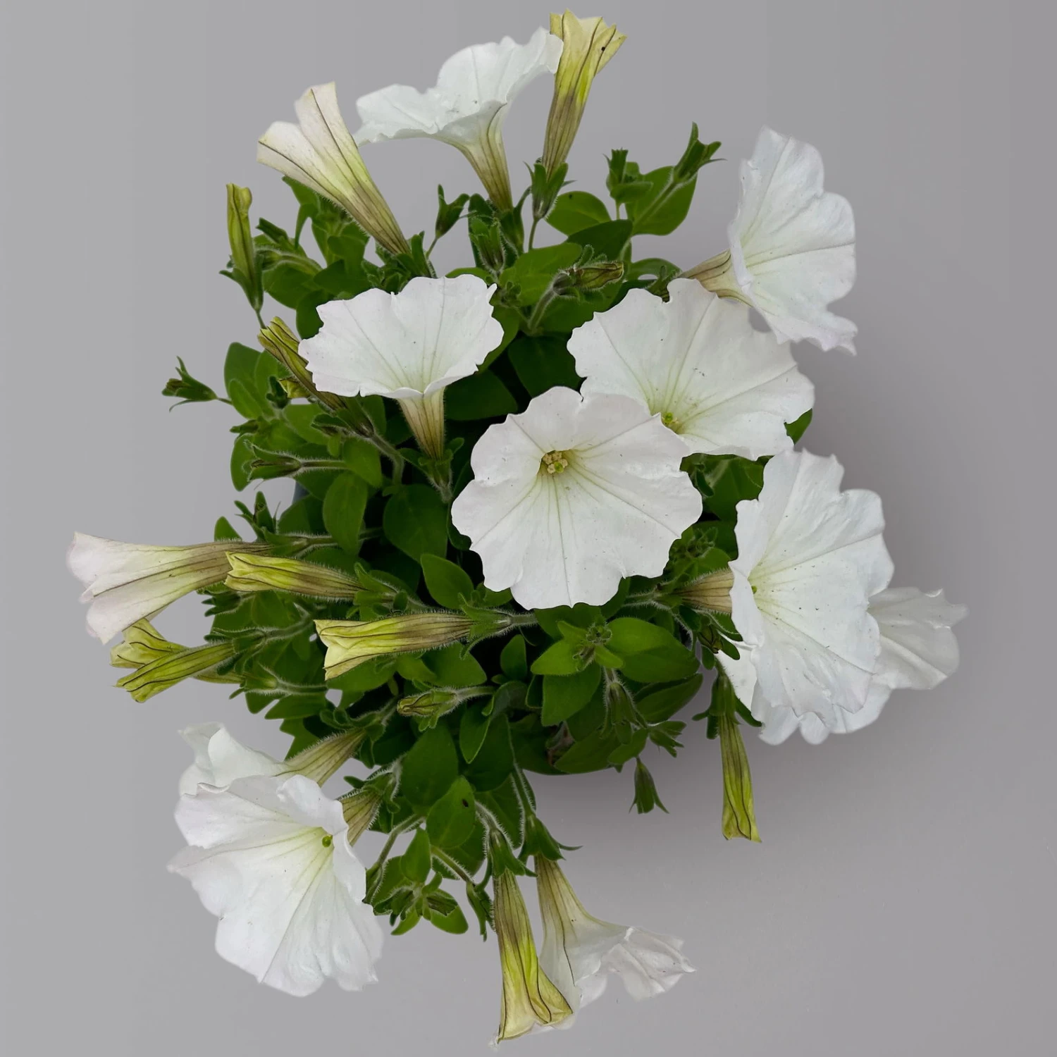Die großen, trompetenförmigen, weißen Blüten, bringen von April bis Oktober Abwechslung in Ihr Zuhause. Die Petunie blüht so üppig, dass die zahlreichen Blüten das Blattwerk optisch fast vollständig überdecken.