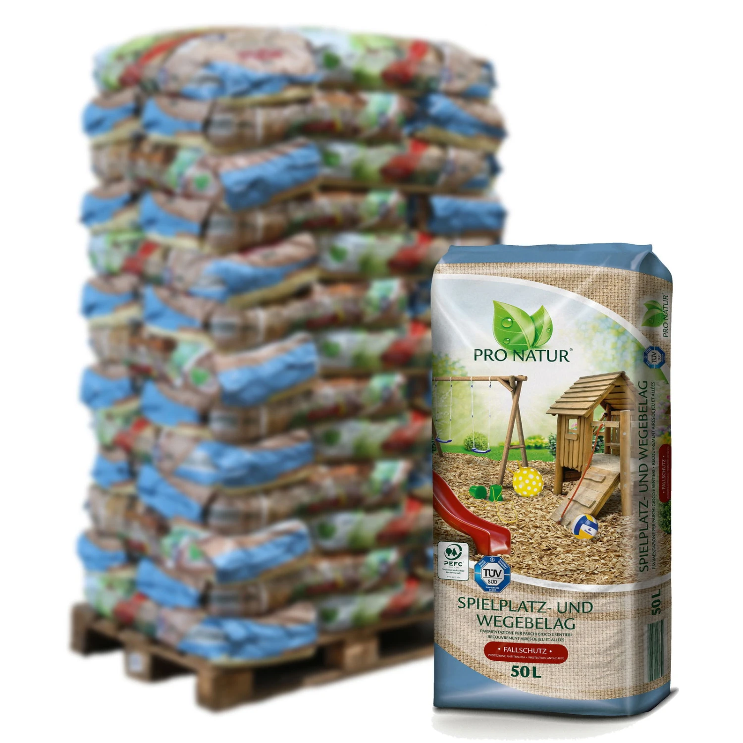Pro Natur Spiel- und Wegebelag ist ein vom TÜV zertifizierter Fallschutz aus naturreinem Holzhackgut. Es ist ideal für Kinderspielplätze geeignet, weil die Struktur des Belags federnd und zugleich dämpfend ist. So wird Ihrem Kind Sicherheit und Fallschutz geboten. Auch als Wegebelag bietet er im Winter Schutz vor Eisplatten sowie Pfützen.