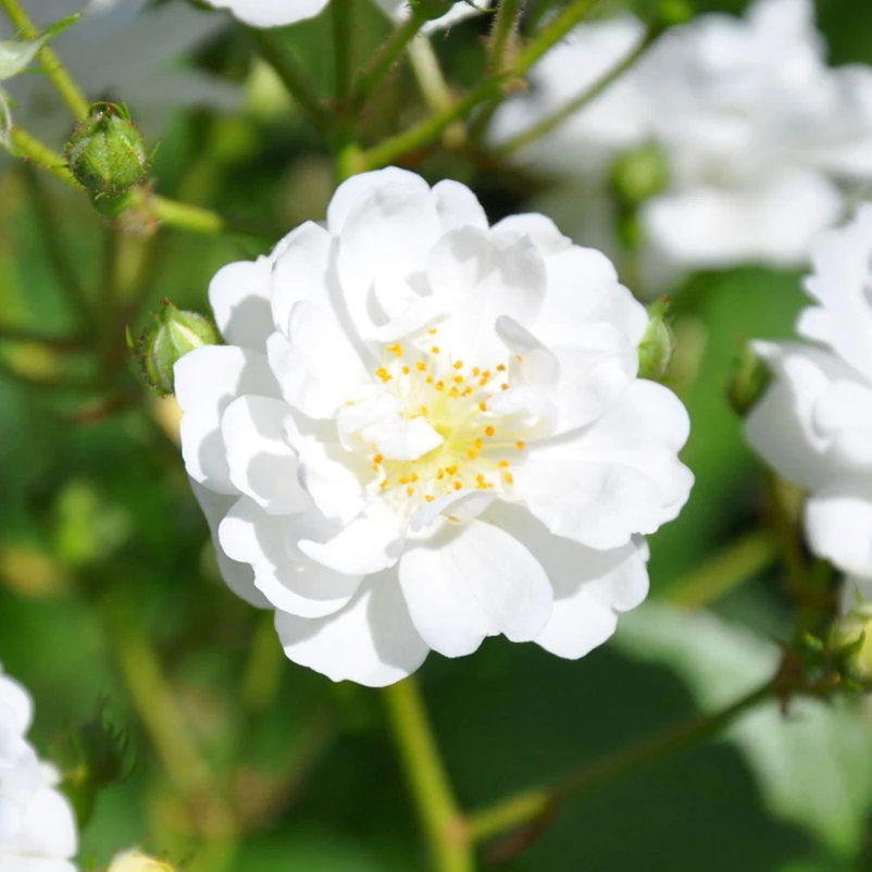 Verhelfen Sie alten Bäumen, hohen Mauern oder Hauswänden, Rosenbögen oder Obelisken zum strahlenden Blütenkleid. Die Ramblerrose ‚Guirlande d’Amour®‘ beeindruckt mit strahlend weißen, gefüllten und duftenden Blüten, die die öfterblühende Rose während der Blütezeit von Juni bis Oktober zum wunderschönen Blickfang machen. Bienen, Hummeln & Co. wissen die gut erreichbaren, sonnengelben Staubgefäße der Bienenweide sehr zu schätzen.