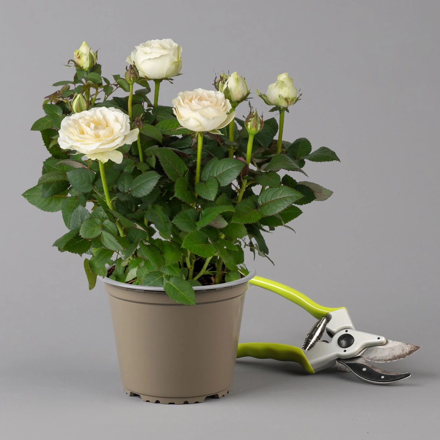 Die Rose (Rosa) überzeugt seit jeher mit ihrer Eleganz und ihren prachtvollen Blüten, ob als Schnittblume, im Beet oder als imposante Rosenbüsche. Mit unserem Set’s erhalten Sie formschöne Topfrosen in weiß, die sowohl als bezaubernde Tischdekoration als auch als Stilelement auf Fensterbank oder Schränken eine tolle Figur machen. Sobald keine Gefahr von Nachtfrösten mehr besteht, kann die Rose auch im Kübel oder Balkonkasten auf Terrasse und Balkon, oder sogar ins Beet im eigenen Garten ausgepflanzt werden.
