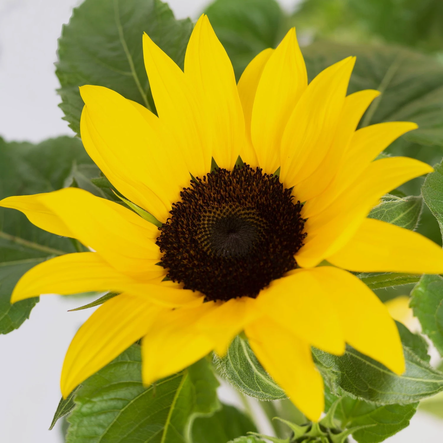 Die großen Korbblüten bestehen in der Mitte aus zahlreichen kleinen Röhrenblüten, die von einem Kranz Zungenblüten umgeben sind. Die Sonnenblume ‚Sunsation’® wird mit Knospe oder Blüte geliefert, sodass sie sofort herrliche Akzente in sonnigem Gelb mit dunklem Auge in Ihrem Zuhause setzt.