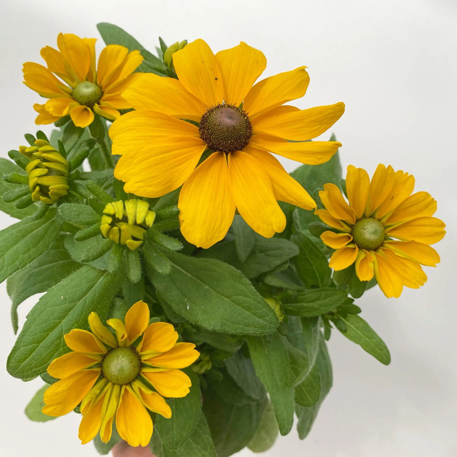 Die Blüte hat ein braunes Blütenkorbchen in der Mitte und ist von den gelben Blütenblättern umgeben. Die Blüte der Rudebeckia ‚Toto®‘ ist ungefüllt und setzt sommerliche Akzente in Ihrem Zuhause.