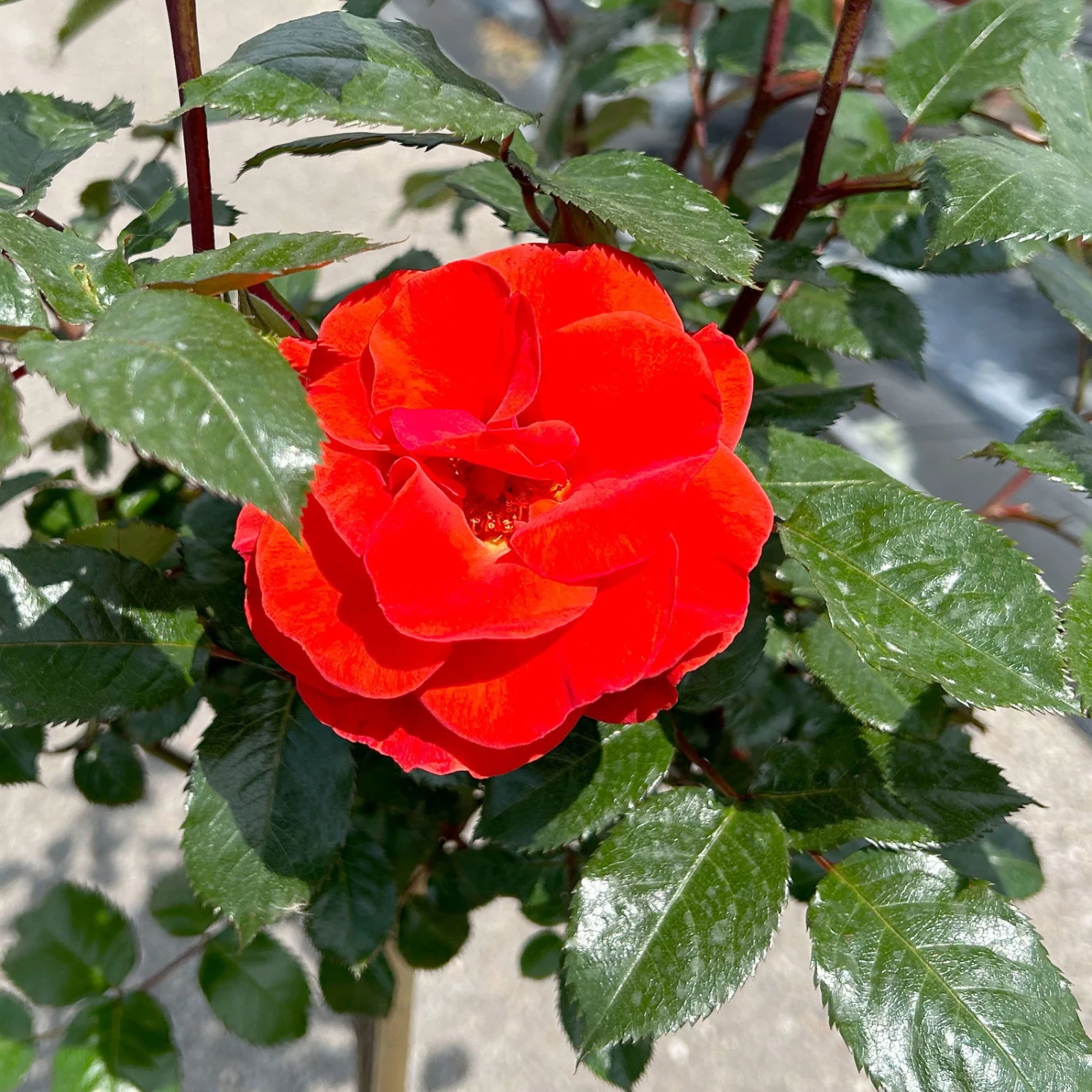 Leuchtender Eyecatcher im sommerlichen Garten. Die Beetrose ‚Westpoint’® begeistert mit halbgefüllten Blüten in leuchtendem Blutorange. ‚Westpoint’® gehört zu den frühblühenden Beetrosen und erfreut von Juni bis Oktober mit mit ihren herrlichen Blüten und einer schnellen Blütenbildung mit starken Folgefloren. Dunkelgrünes, glänzendes und überaus gesundes Laub unterstreicht die interessante Farbwirkung der Blüten.