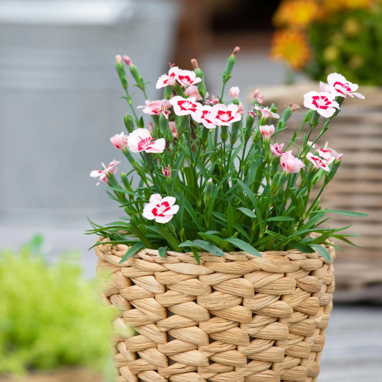 Diese Dianthus-Hybride ist ein richtiges Highlight unter den Duftnelken. Die Sorte ‚Peach Party®‘ überrascht mit einem faszinierenden Farbspiel, denn die zunächst apricotfarbenen, duftenden Blüten entwickeln während der Saison ein dekoratives Auge in leuchtendem rot. Die Duftnelken blühen ausdauernd über den ganzen Sommer hinweg bis zu den ersten Frosttagen. Am wohlsten fühlt sich diese Staude an einem hellen, gerne vollsonnigen Standort. Im Halbschatten gedeiht Ihre Duftnelke ‚Peach Party®‘ ebenfalls prächtig. Für die üppige Blüte sind durchlässige und nährstoffreiche Böden wichtig. Staunässe und Trockenheit sind unbedingt zu vermeiden. Versorgen Sie die Zierpflanze mit einem Flüssigdünger, damit die Nelke dichte Blütenteppiche bildet. Diese Dianthus-Hybride macht im Blumenbeet und im Pflanzkasten eine hervorragende Figur.