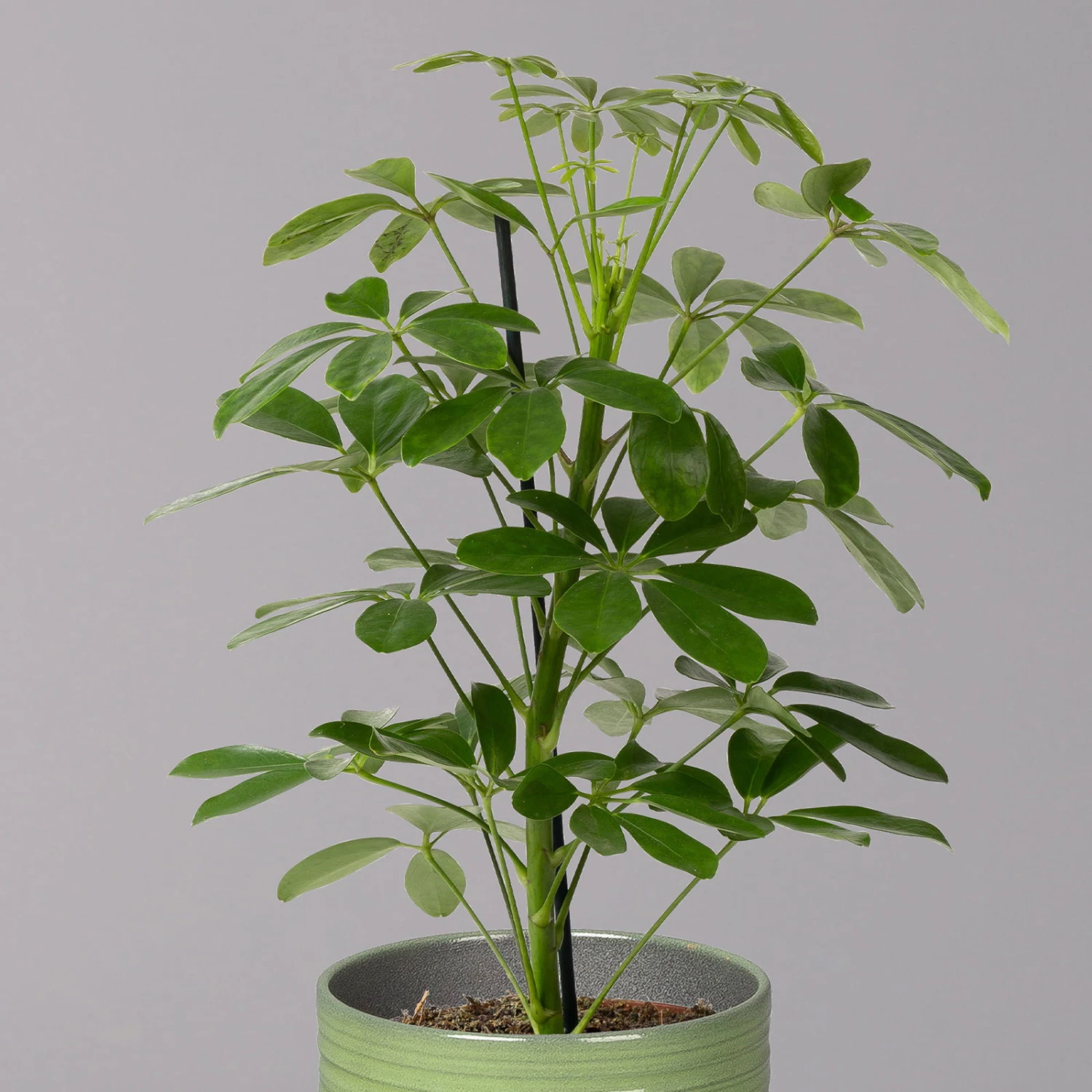 Die Strahlenaralie (Schefflera arboricola) zählt zu den beliebtesten Büropflanzen, da sie sehr robust und besonders schnellwüchsig ist. Die ursprünglich aus Taiwan stammende Tropenpflanze besticht mit den typisch strahlenförmig angeordneten Blättern, die kräftig grün und glänzend sind. Die Pflanze wächst schlank aufrecht und kann bis zu 2 Meter hoch werden. Ab einer gewissen Höhe bietet sich ein Moosstab als zusätzliche Fixierung an, welcher der Pflanze als Stütze dient.