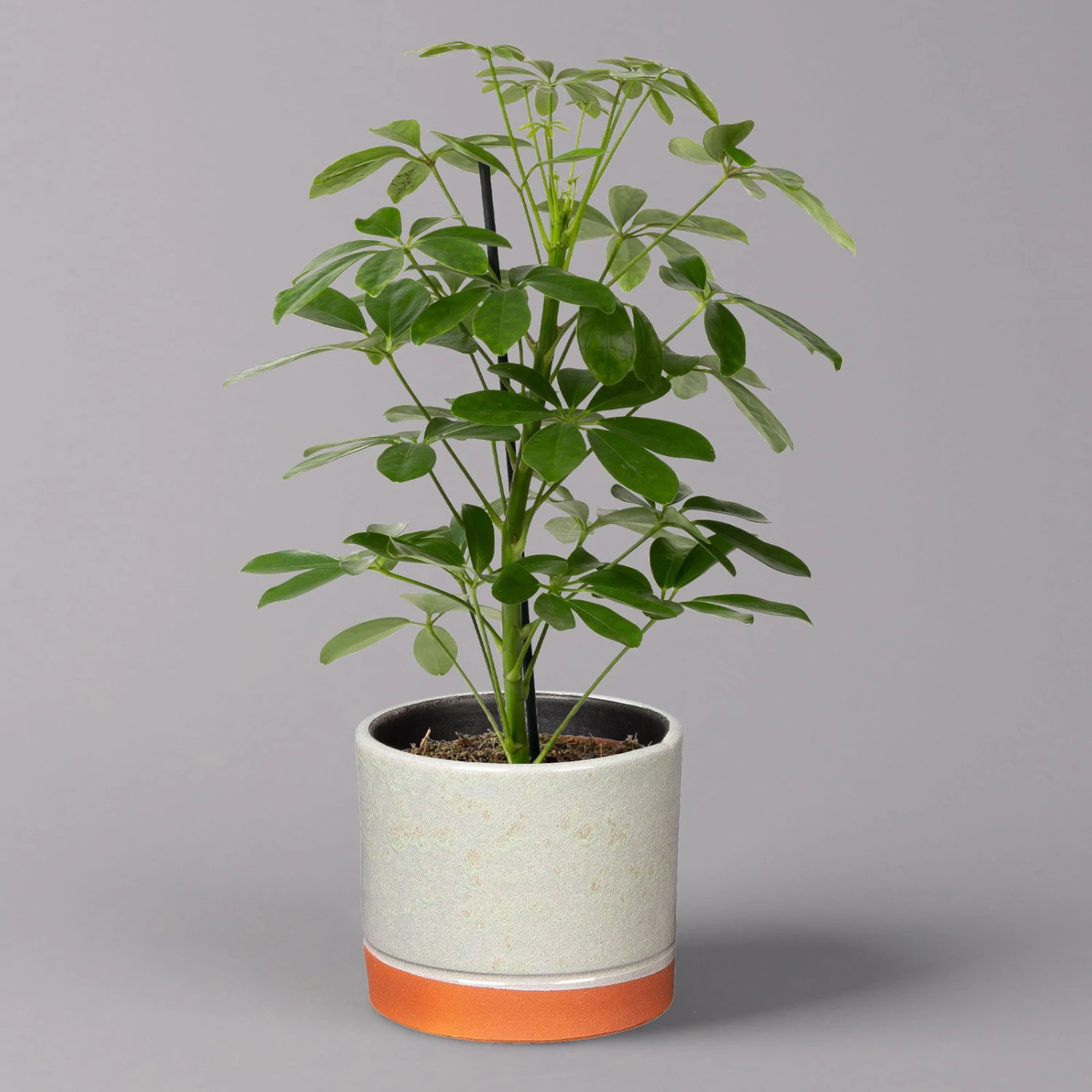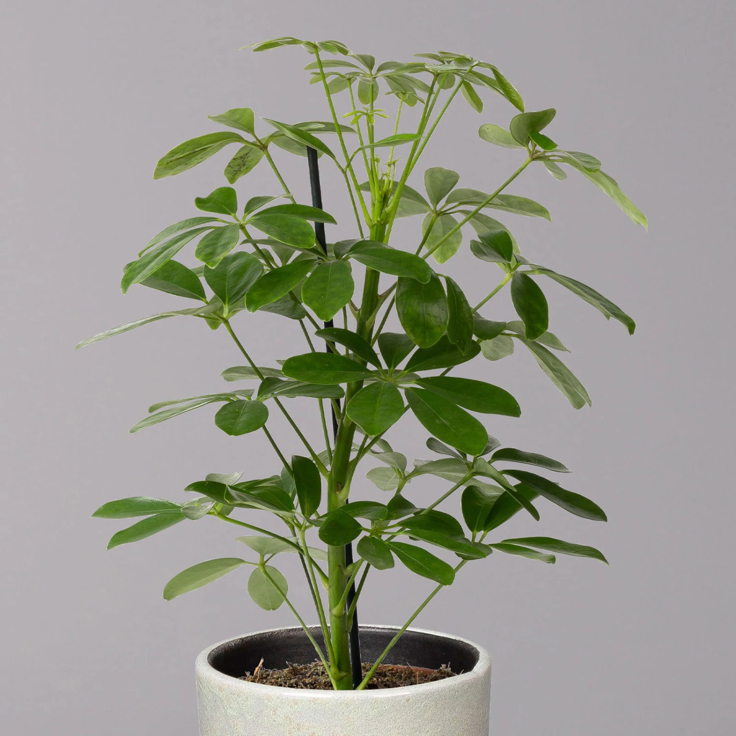 Die Strahlenaralie (Schefflera arboricola) zählt zu den beliebtesten Büropflanzen, da sie sehr robust und besonders schnellwüchsig ist. Die ursprünglich aus Taiwan stammende Tropenpflanze besticht mit den typisch strahlenförmig angeordneten Blättern, die kräftig grün und glänzend sind. Die Pflanze wächst schlank aufrecht und kann bis zu 2 Meter hoch werden. Ab einer gewissen Höhe bietet sich ein Moosstab als zusätzliche Fixierung an, welcher der Pflanze als Stütze dient.