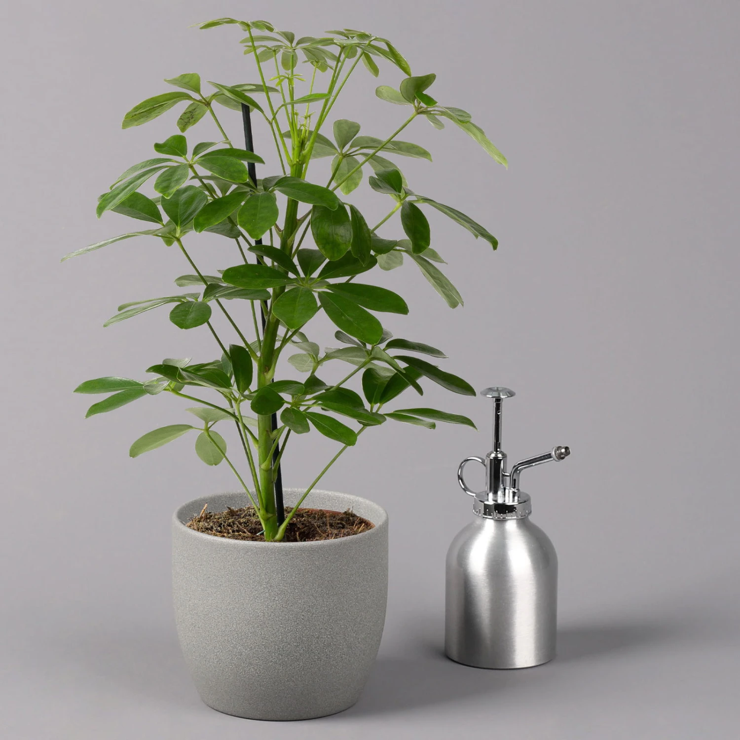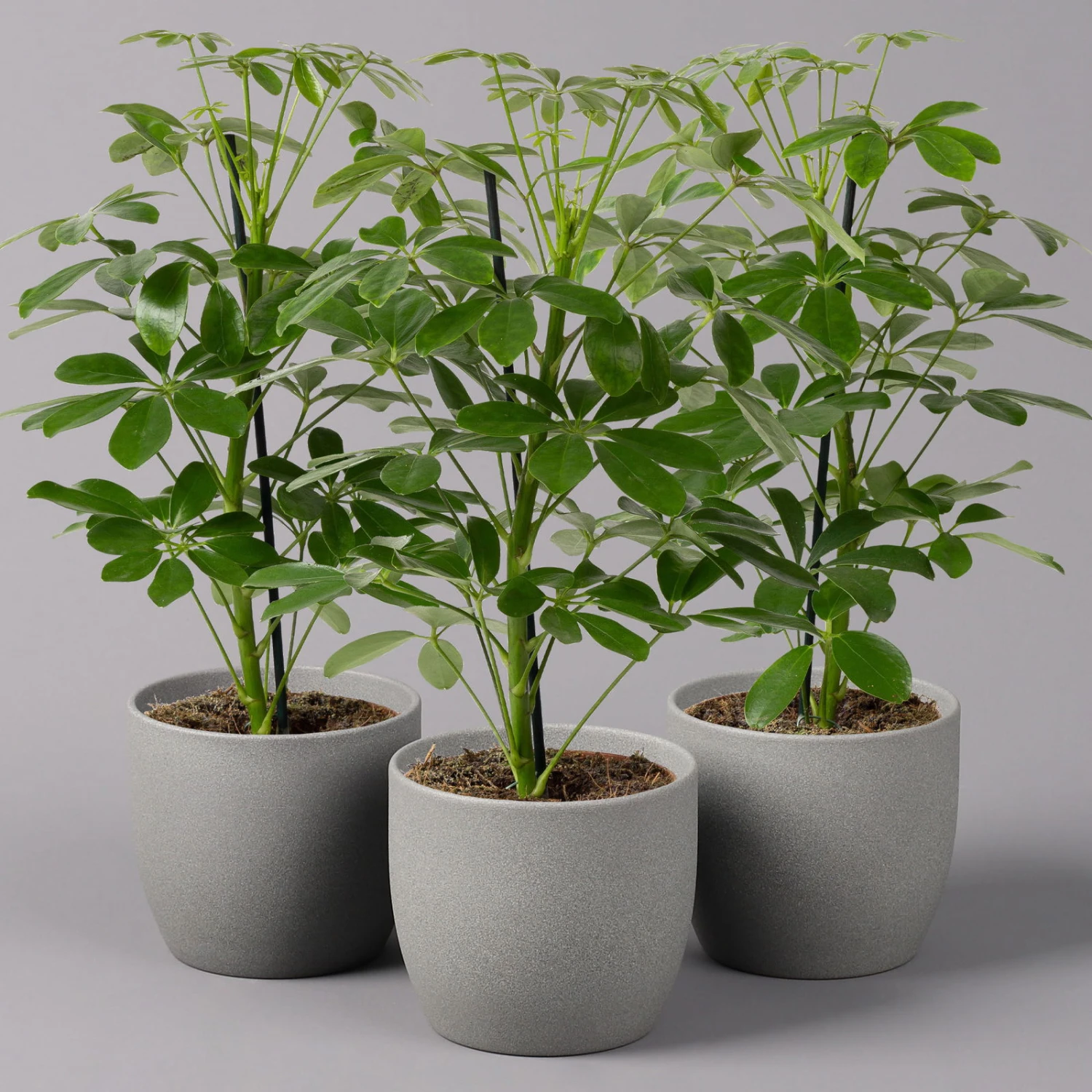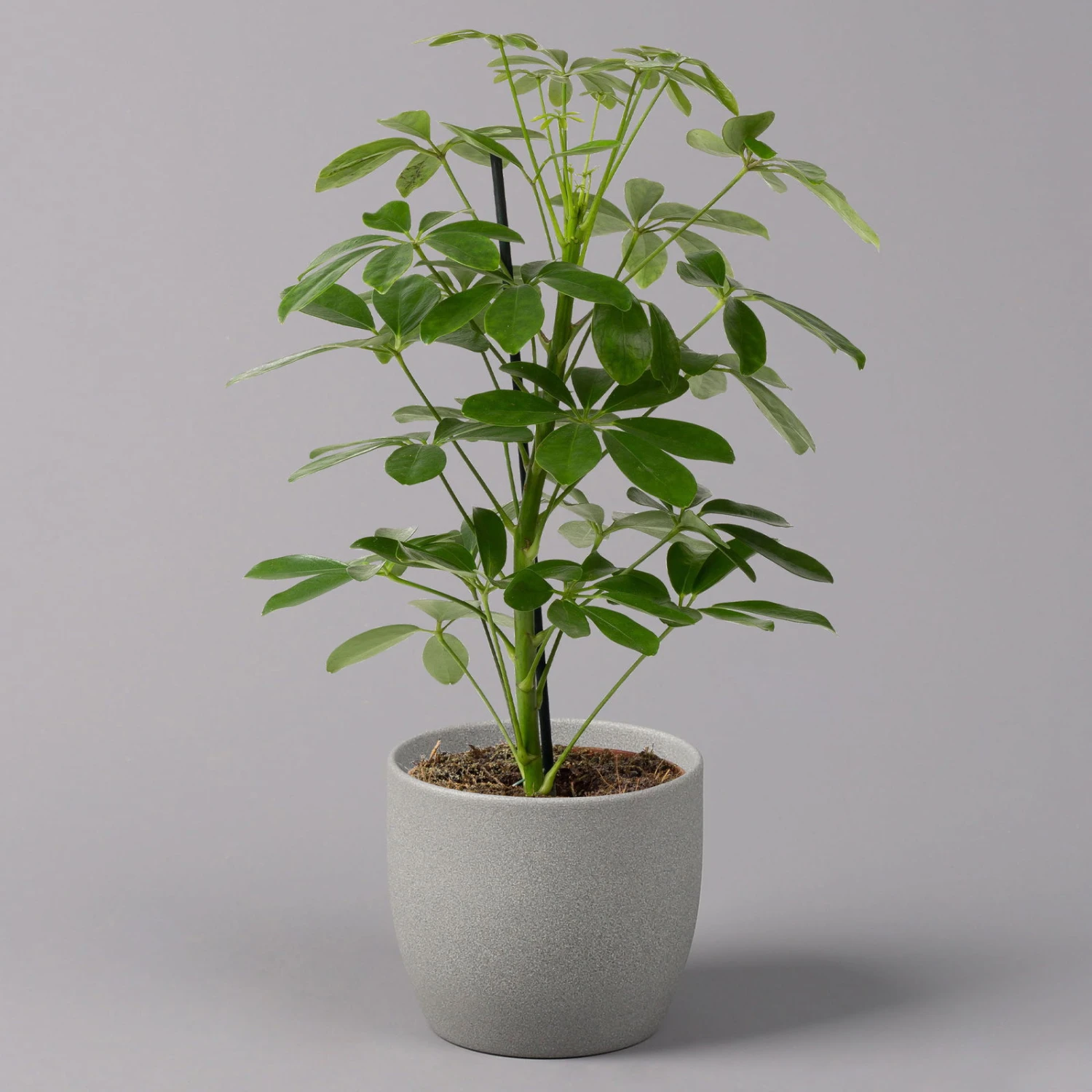 Die Strahlenaralie (Schefflera arboricola) zählt zu den beliebtesten Büropflanzen, da sie sehr robust und besonders schnellwüchsig ist. Die ursprünglich aus Taiwan stammende Tropenpflanze besticht mit den typisch strahlenförmig angeordneten Blättern, die kräftig grün und glänzend sind. Die Pflanze wächst schlank aufrecht und kann bis zu 2 Meter hoch werden. Ab einer gewissen Höhe bietet sich ein Moosstab als zusätzliche Fixierung an, welcher der Pflanze als Stütze dient.