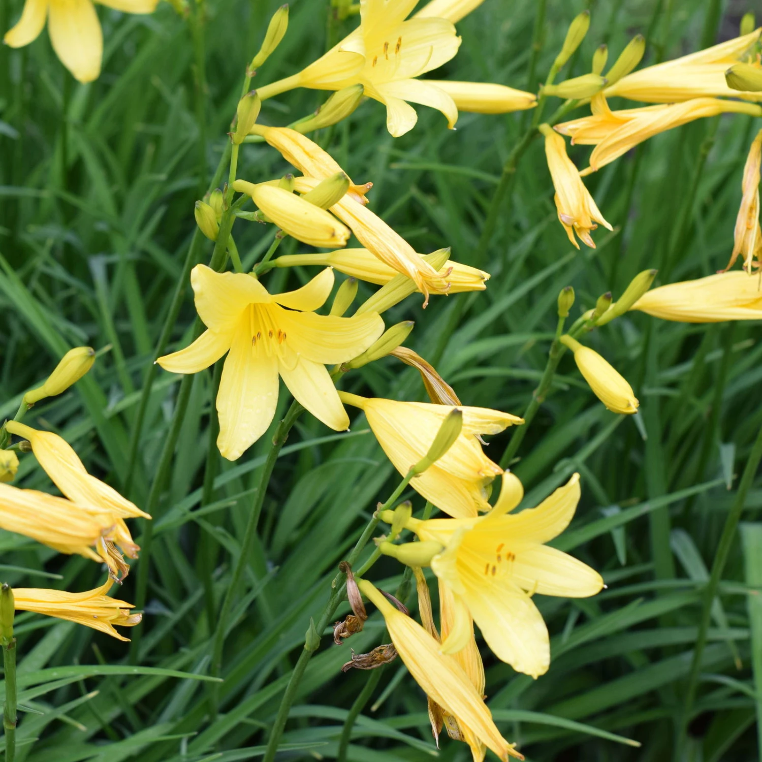 Die schmalen Blüten der Zitronen-Taglilie sind trichterförmig und stehen zahlreich an verzweigten Blütenständen. Die Blüten in hellgelb setzen von Juni bis August herrliche Akzente in Ihrem Garten. Sie blühen in der Abenddämmerung auf, duften nachts intensiv nach Zitrone, setzen ihre Blüte aber am nächsten Tag fort. Die einzelne Blüte blüht nur einen Tag – daher der Name Taglilie.