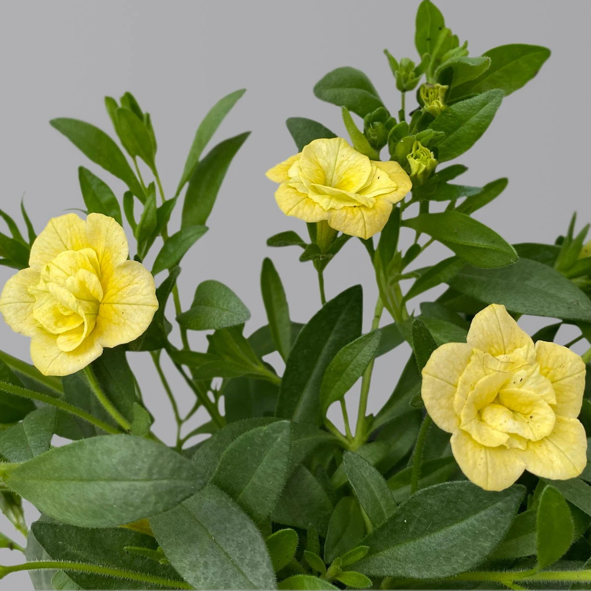 Die elliptischen und leicht klebrigen Blätter der Zauberglöckchen (Calibrachoa Hybride ‚MiniFamous® Neo Double Lemon‘) begeistern mit ihrem kräftigen Grün. Das Zauberglöckchen wächst in Kasten, Kübel oder Ampel kompakt bis überhängend. Auf dem Beet oder Grab ausgepflanzt, ist es bodendeckend. Die Zauberglöckchen zählen zu den Nachtschattengewächsen. Die bei uns einjährige Sommerblume kann eine Wuchslänge von ca. 50 cm erreichen.